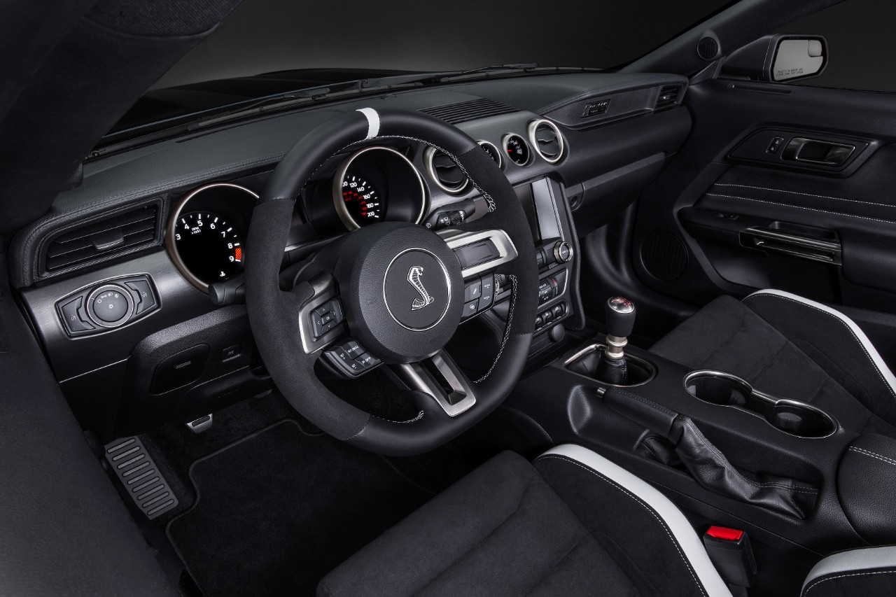 There is a Tremec six-speed manual bolted to the back of the 5.2-liter V8, and while smaller in displacement than the 5.4-liter V8 that was in the Cobra R, it retains the DOHC and gains about 215 horsepower for a total of 500 hp and 400 lb-ft of torque. It also uses a flat-plane crankshaft for the first time in a Ford engine. So, instead of a 90-degree interval between cylinders, there is 180 degrees for higher revs and a very unique sound. It will also be louder thanks to the removal of a set of resonators in the exhaust for weight. Channeling that power and torque to the Michelin Pilot Sport Cup 2 tires, which are unique to the GT350R, is a Torsen differential.