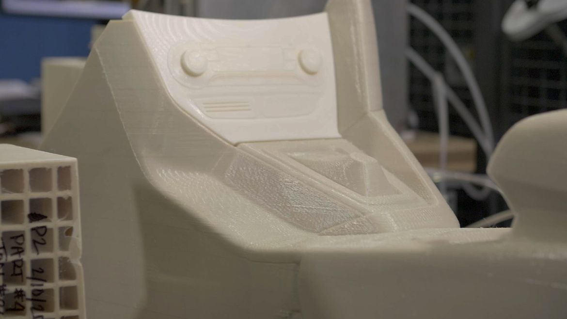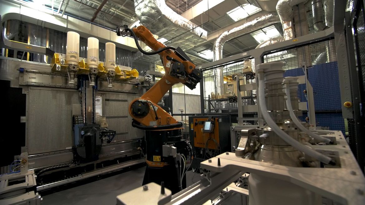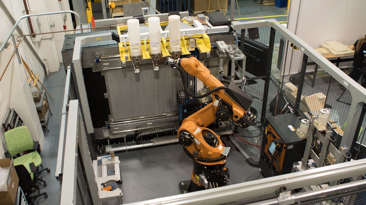 In addition, the process uses proprietary micro-pellet powder, instead of the filament-like material used by most commercial printers. When building an actual part, the thermoplastic micro-pellet powder is fed into a screw-drive and heated and transformed into a part. The entire process can then be continued for hours and hours, thanks to a robotic arm capable of refilling the canisters used to print the parts.