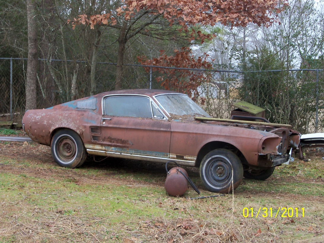Heres my 67 that I want to do as little to the outside as possible and make it resemble the Stang in the last scene of Gone in 60. Want to add side scoops and decklid and leave them appearing as bare/white fiberglass. Its already old red oxide primer so I have a start. Its an S code, but have a 351W with Crane fireball cam to drop in it.