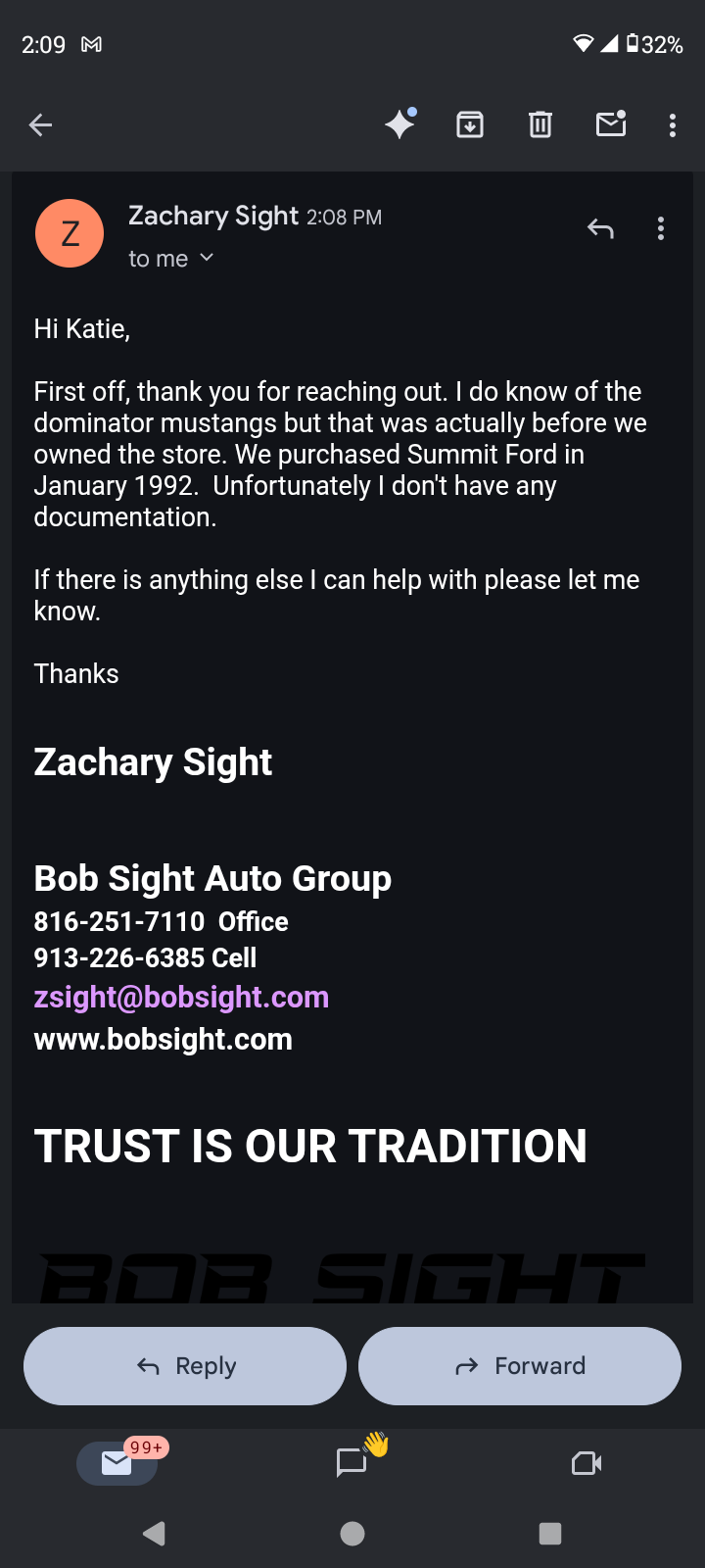 I have located in 1987 Ford mustang dominator it is a rare find I found it in a field in Nevada Missouri. I had never heard of a dominator and I don't know much about them but from what I do know they're pretty rare and unique I have even reached out to Bob site forward which is the new owners of the previous Lee summit Ford to try to get any sort of information and of course none of them knew what I was talking about because it has been decades. I have restored many fox bodies in the past but this one is quite frankly one of a kind. I did a Carfax on the VIN which comes back to the first owner who took very good care of it and even registered as a historical vehicle and then switch hands to someone who did not take very good care of it put a lot of miles on it and they're sat in the field. A very sad situation indeed. I guess I am posting this to see if anybody has any information that would be useful as well as direct me to somebody who maybe keeps a directory of these cars any information would be greatly appreciated thank you