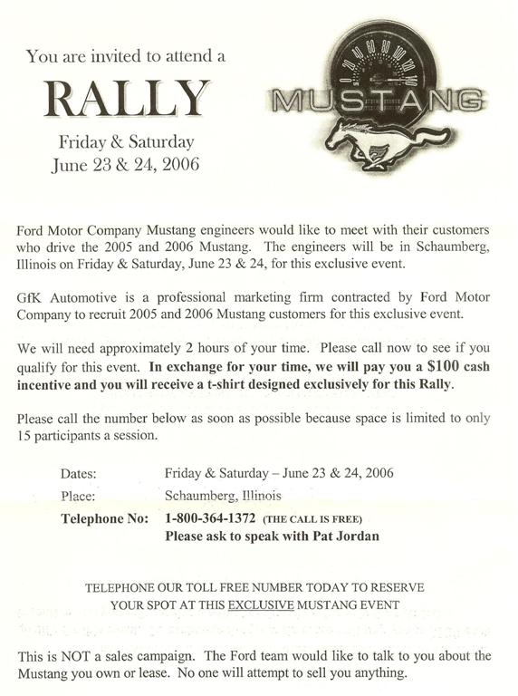 I was just going to post a thread about this odd phone call I just recieved from some marketing group asking me if I would come meet with the ford engineers in exchange for $100 and to ask if anyone here had heard of such an event or if it was just some sales scam. However, since I am not the only chicago area person to recieve this invite I guess it's legit and will go.
