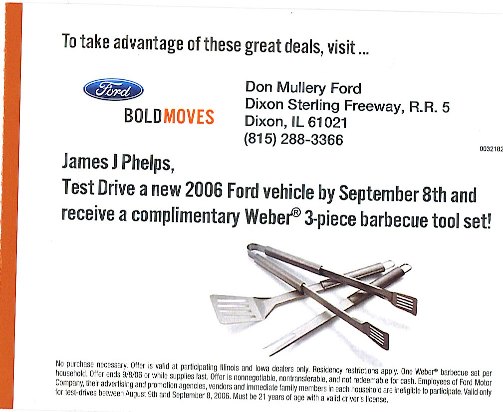 Ford sends me all kinds of schtuff like that. Last year at this time, I received the same certificate. It must have to do with when you bought your last car because I signed the papers on my minivan 8/31/2003. On the flip side of that certificate, if I test drive any new Ford until Sept. 8, I will get a Weber grill utensil set. I used to get certificates from Mercury for $50 travelers checks with any test drive. Let me tell you, the dealer was getting tired of seeing me!