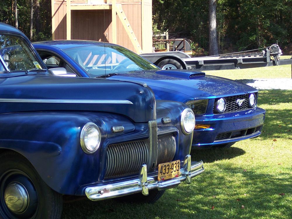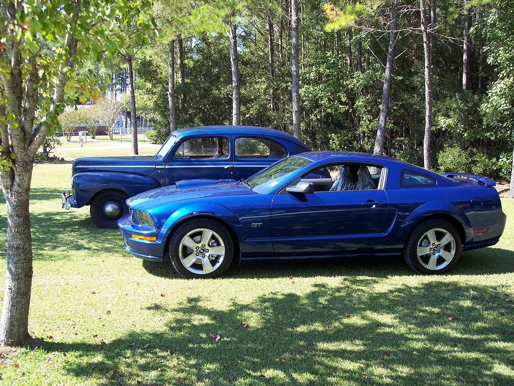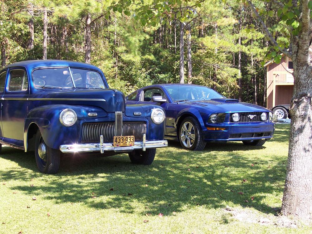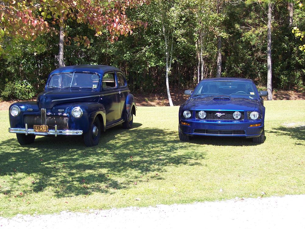 Here are some Pics of my friends '42 Ford flathead V-8 and my '07 Mustang.The '42 is a rare car beacause it was only made for 3 months prior to Pearl Harbor.It is bright blue with a tan interior and my '07 is vista blue with black interior.The two colors are very similar even though 65 years separate them