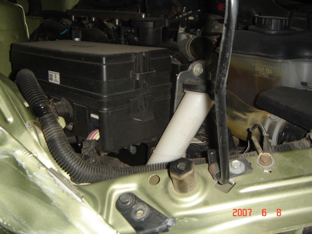 attaching a couple pics- first shows the upper unibody(welded together) structure, second shows the passenger front tip of that- top left corner you can just see the black electrical box...the upper 'arm' will need pulled back into shape, or replaced, be sure they seamseal/paint all the welds- they probably have never seen rust over there, but when it comes back to a non-desert home, you'll want that all protected real well