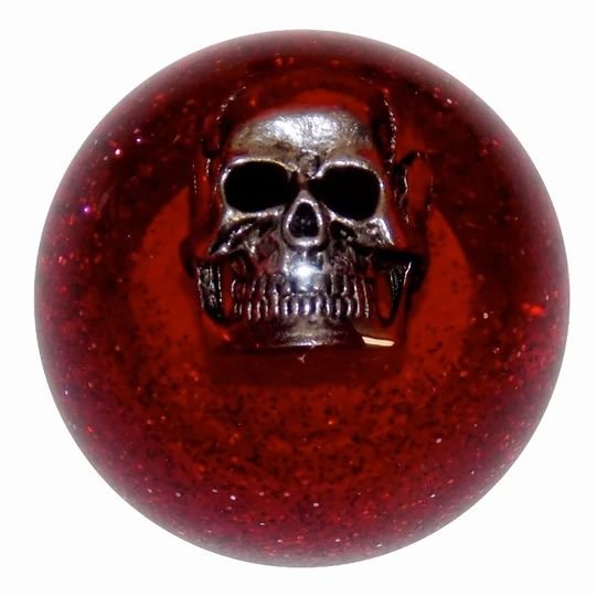 Since I slightly mangled the shift **** while replacing the boot and jam nut, I decided to try a bit of "'60's hot rod" nostalgia, and ordered this dude; a red glitter shift **** with embedded skull! That's boss, daddy-o!