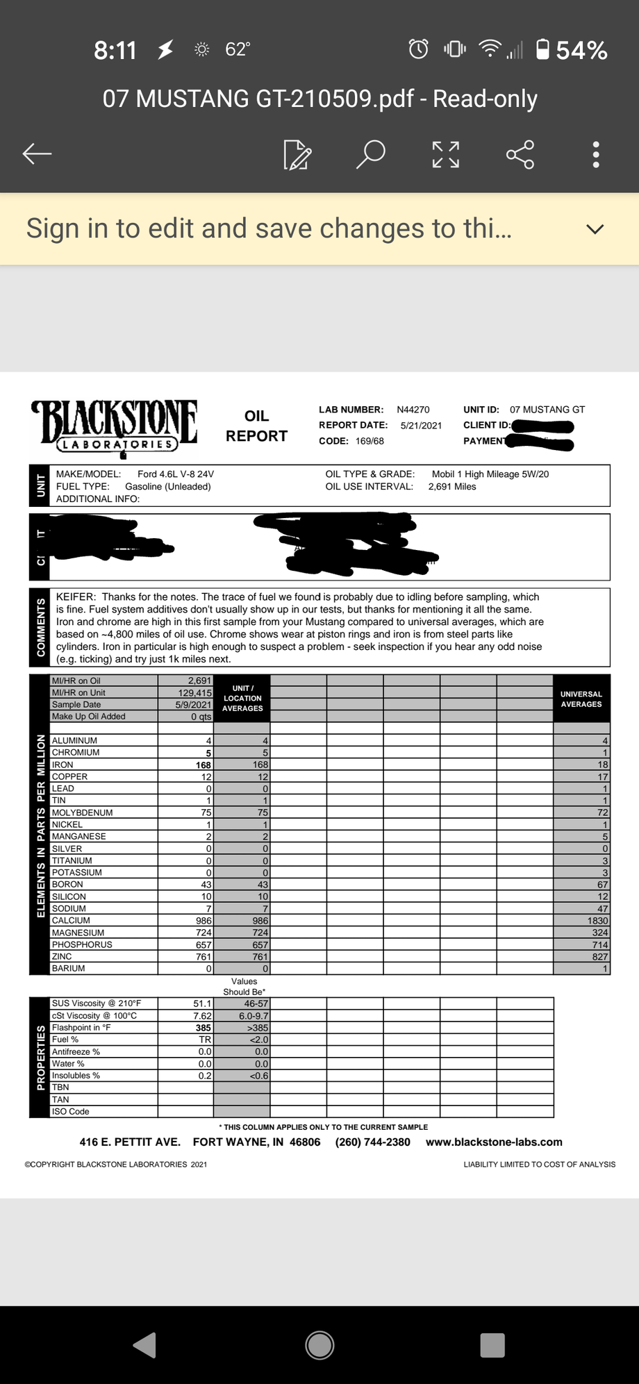 For the first time I decided to use Blackstone labs to analyze my oil and they stated the iron content was fairly high and might be concerning.