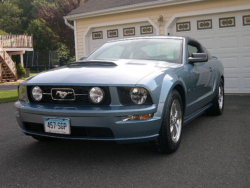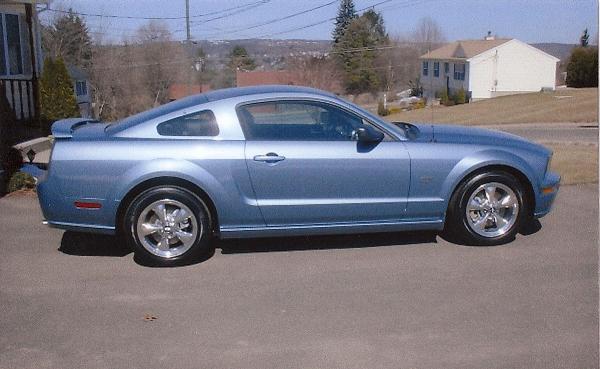 To start all the rims are 17x8 Ford Polished Bullitts. Front tires are 225/65/17s and rears are 275/50/17s. The back has been lowered only with the Roush rear springs. I've included an old picture with stock tires for comparison.