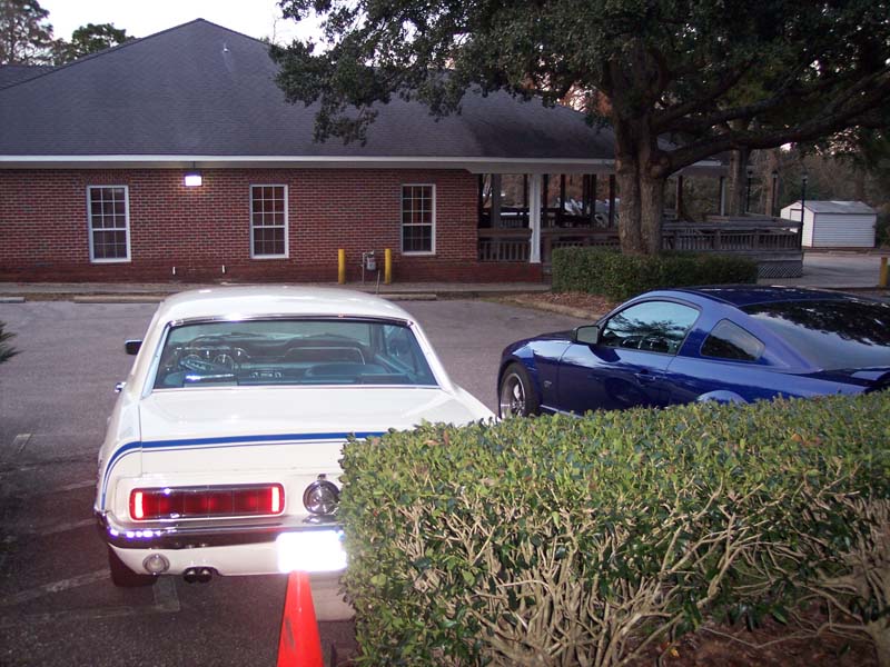 My boss at my new job is a Mustang guy. He has a '68 California Special and a '69 Shelby GT350 convertable. The GT/CS is authentic and he rarely drives it, but the Shelby is a clone and he drives it to work often. Even though it's a clone it's still really cool to see it in person. Here are a few pics I took of the '69 with my car at the office.
