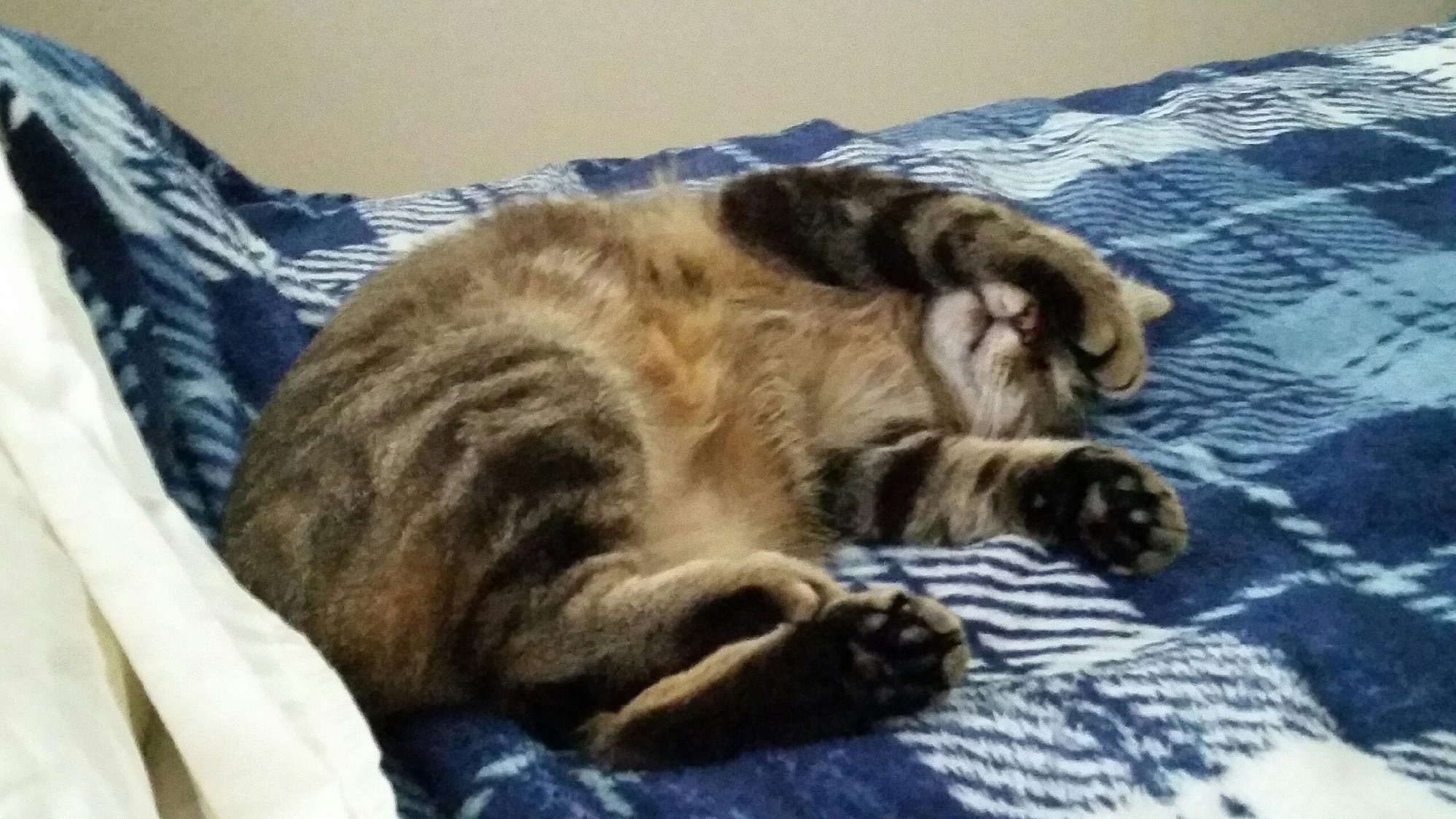 The little monster, acts more like a dog than a cat. Think he's got some Manx in him, no tail at all, barely even a bump, no nub.