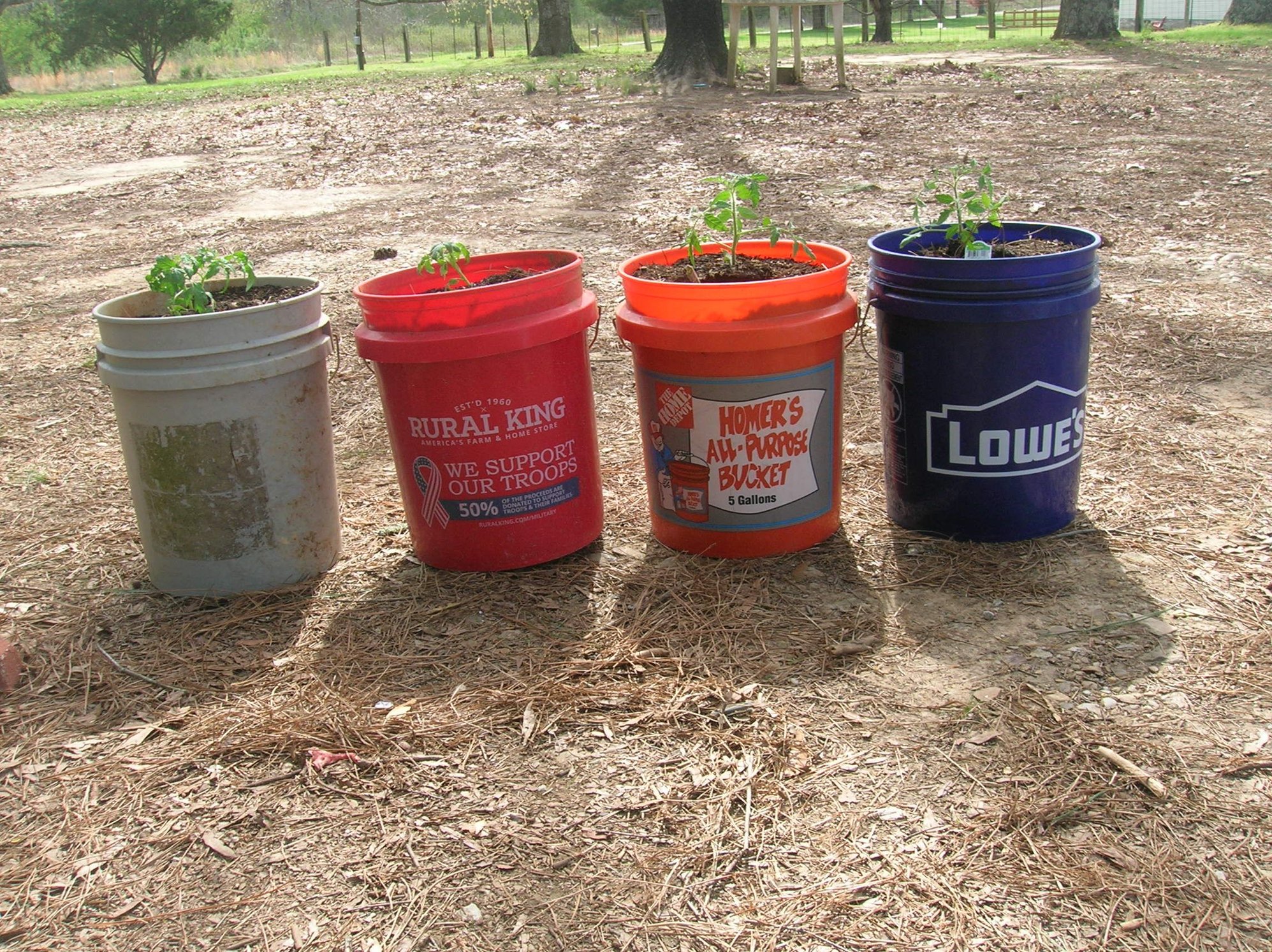 all right then ,, we have a contest .. which 5 gallon bucket will grow the best tomato's .. i have 4 buckets from 4 of the most favorite home improvement stores .. i think the gray one is a walmart bucket ,, we shall see in 90 days who will be the winner