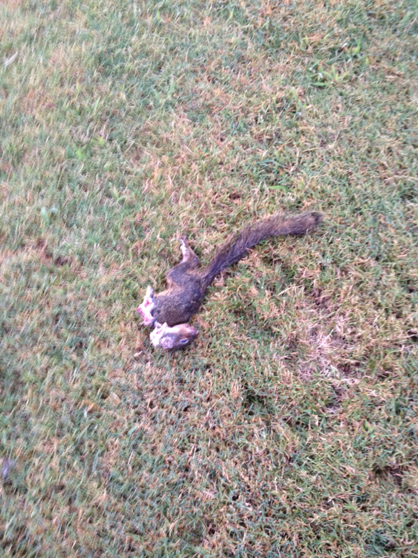 My cat has a taste for squirrel. I walked out Saturday morning to find this in the yard. It spent most of the morning licking the brains out of the skull.