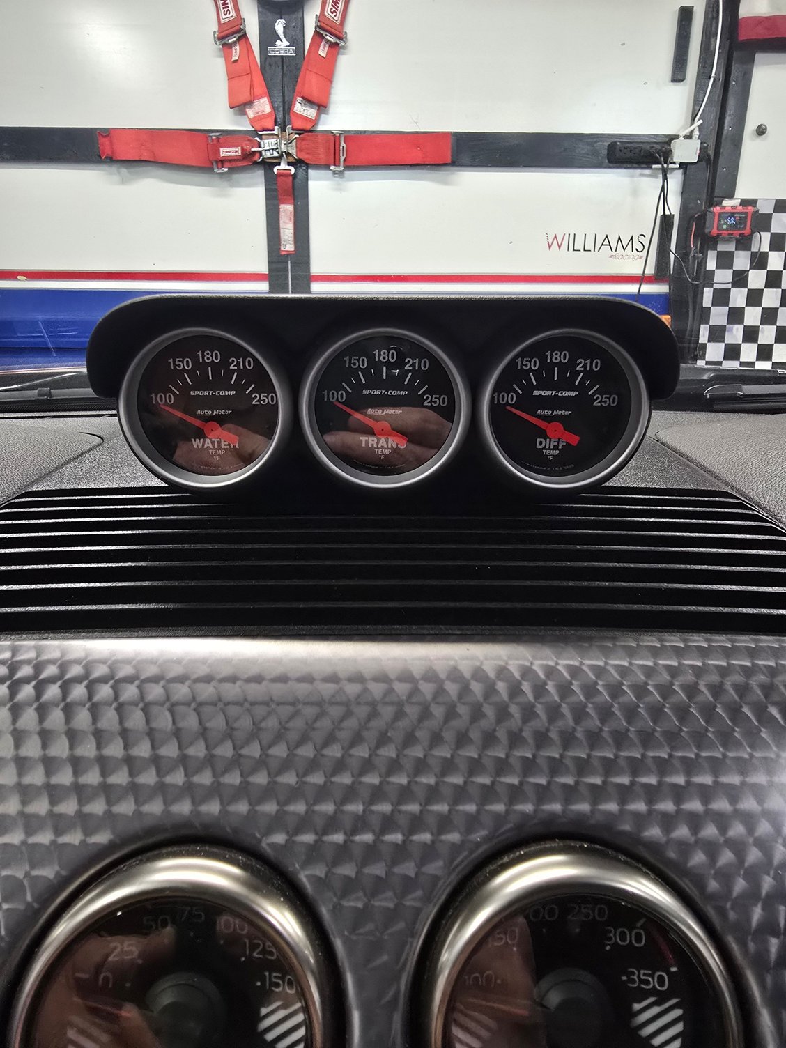 Sure, for the diff. I have a diy diff cooler installed that is fed from the drain plug with 6an fittings. I drained the diff fluid and installed a 6an temp sensor fitting in line coming out of the 1/2"npt to 6an fitting, that is installed directly into the drain and refilled the diff. For the water temp. I installed a inline heater hose (19mm dia.) fitting. I pinched the heater hose on each side of the area I made the cut into the hose. And I also removed about 3/4" of hose so that it would have the same fit after the inline was installed. Make sure you install the inline fitting on the engine to heater core hose. For the trans. I have a PPE alum trans pan that has a sensor port. When I installed the pan I installed the sensor so that I didn't have to deal with it now, (installed over a year ago). Please note that i installed a 1/8NPT jam nut on the fittings before install and installed slip on cramped lug/ground wire so that i can insure i had a good ground to run from the sensor to a grounding source. Then simply attached the sensor wire to the top of the sensor. I should add that I did not disturb the OMG gauges that are in the center instrument cluster. I don't like to use those when I am driving the car at the track because I have to look down to see them. I like all my gauges as close to eye level as possible.