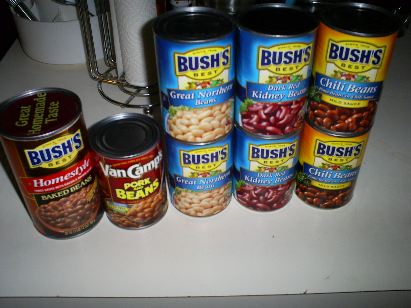 For my crock pot, I use 2 lbs of ground beef, 6 slices of bacon, cut into thirds, 1 can of pork and beans, 2 cans of kidney beans, 2 cans northern beans (you can use limas), and 2 can's of chili beans. For spice I add onion powder, chili powder, garlic powder (family secret ingredient...for everything, haha), some oregano, salt, pepper, and a bit of cinnamon, as well as some ketchup, lots of BBQ sauce (hotter), and a bit of hot sauce on occasion.