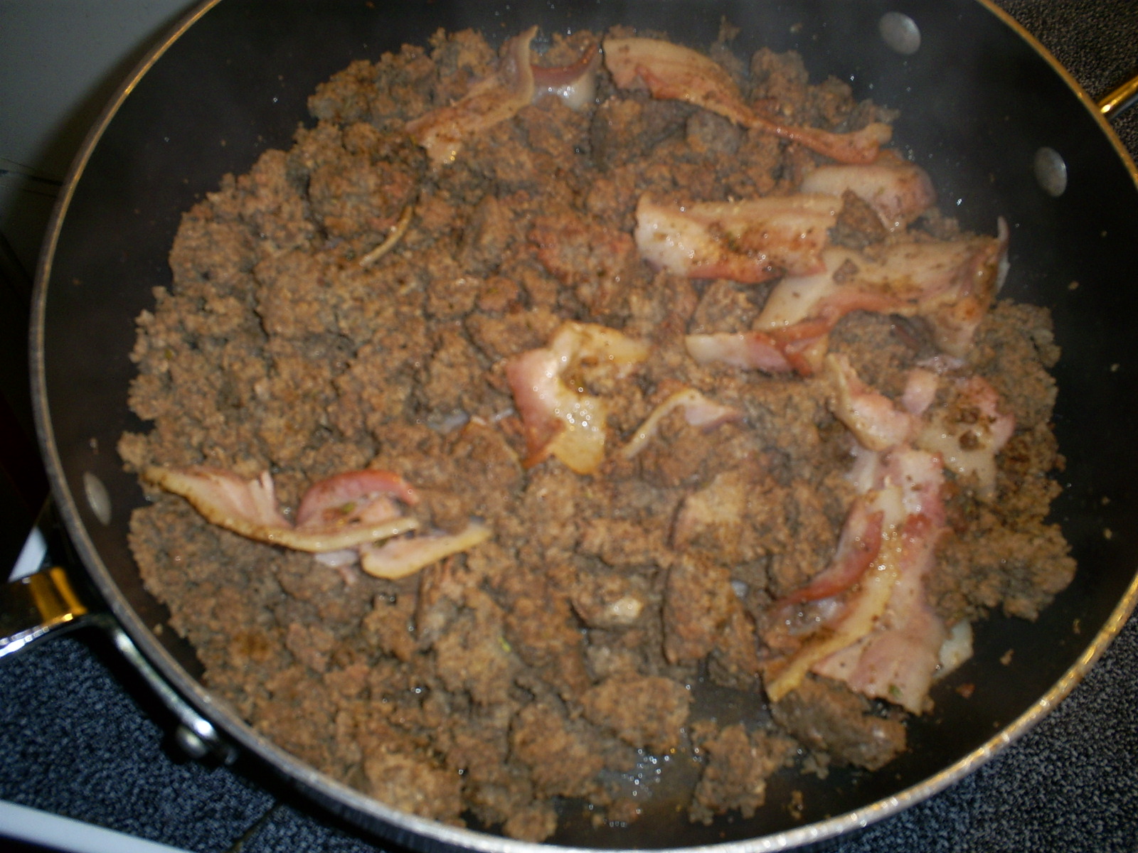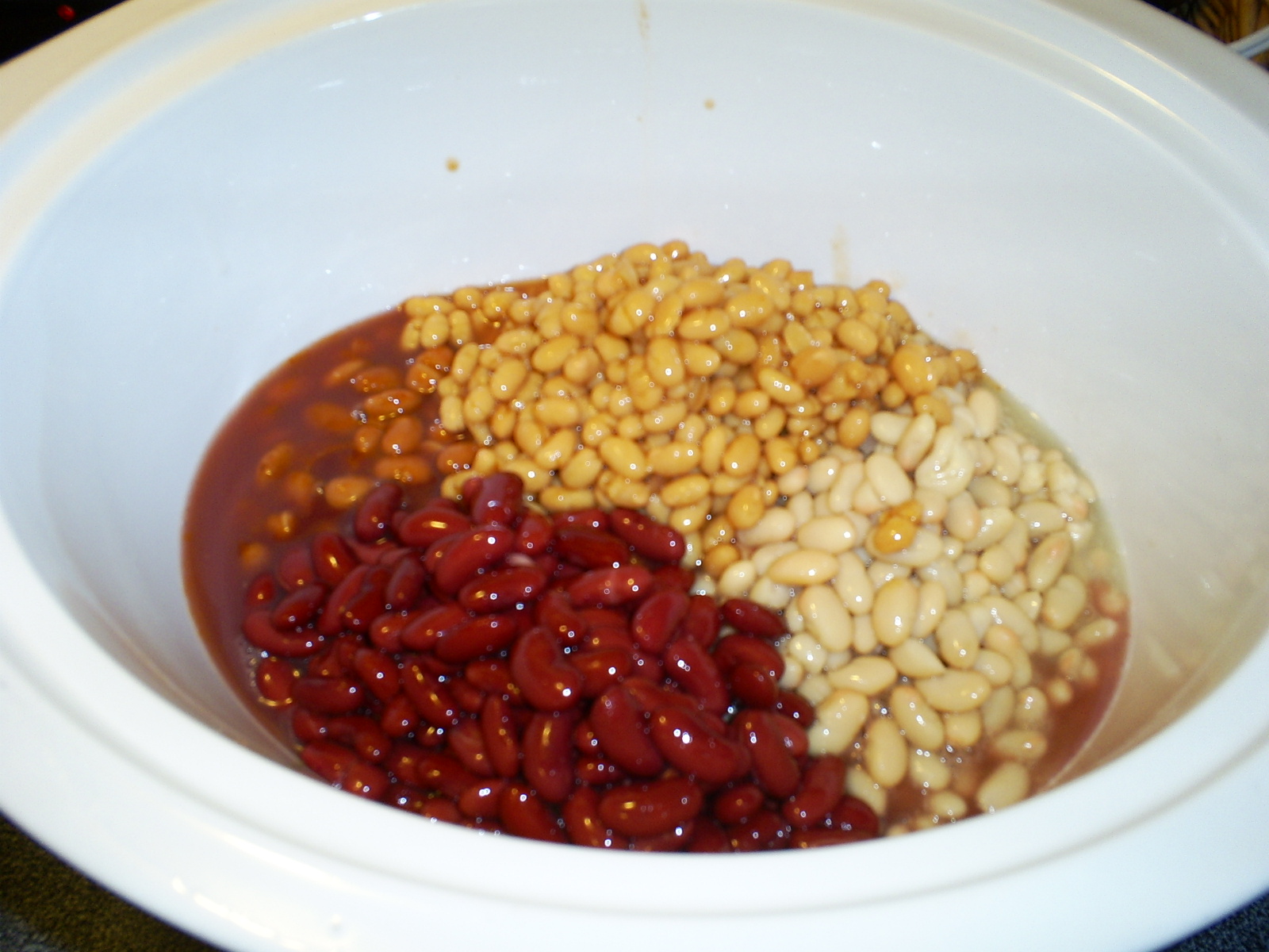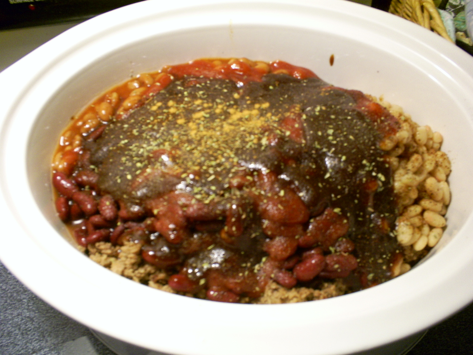 When I brown the hambuger, I brown the hamburger, putting on salt, pepper, garlic salt, chili powder, and oregano...then put in the bacon, and let it all simmer down. I leave a bit of the fat in there to hit the bacon with some extra flavor, draining it all off before putting it in the crock pot. I usually put in one can of the beans (I drain most of the liquid out of the canes, but you want a little bit to be part of the sauce), then the hambuger and bacon, then another layer of beans and the seasoning, seems to mix better that way.