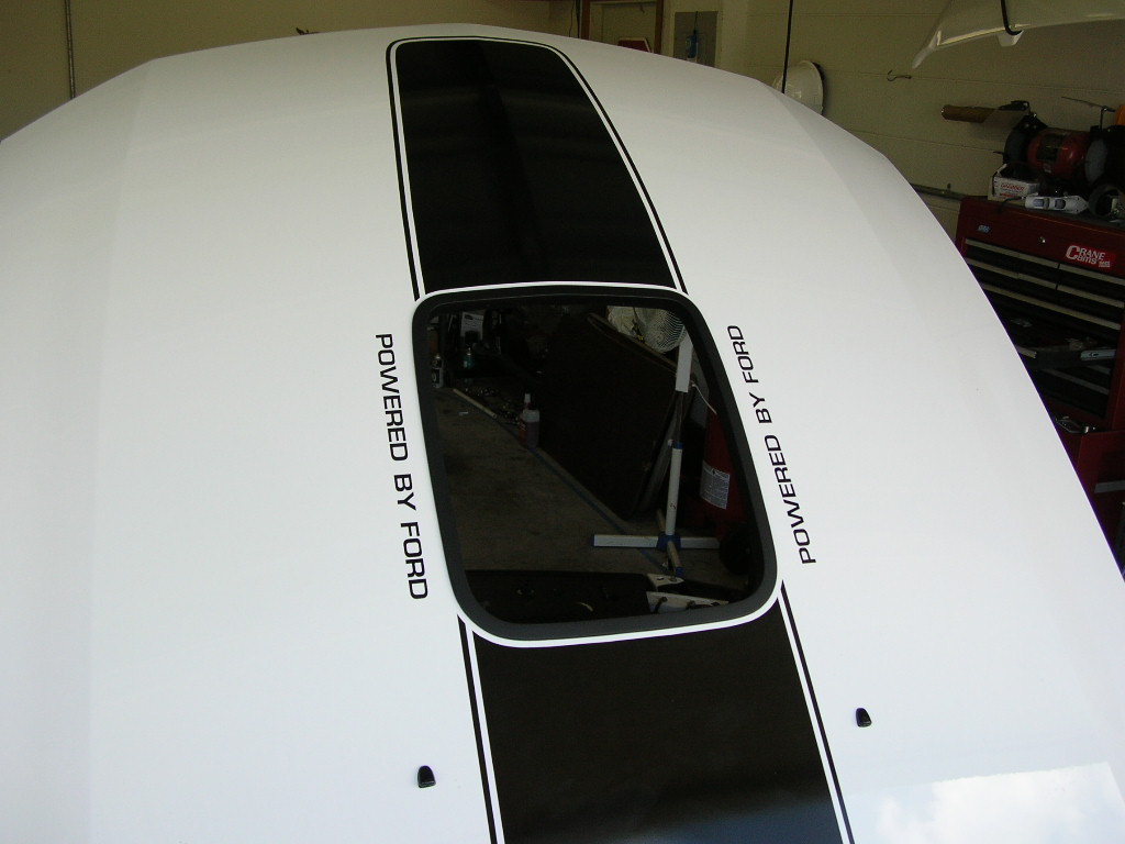Then order the stripe kit for the 2003-04 Mach 1. The front piece will still look good (that's what I had on first) and it will still contour the shaker trim ring good enough. The back piece will be smaller with a curve inward toward the shaker scoop. It's a direct replacement for those cars, so it will look like this: