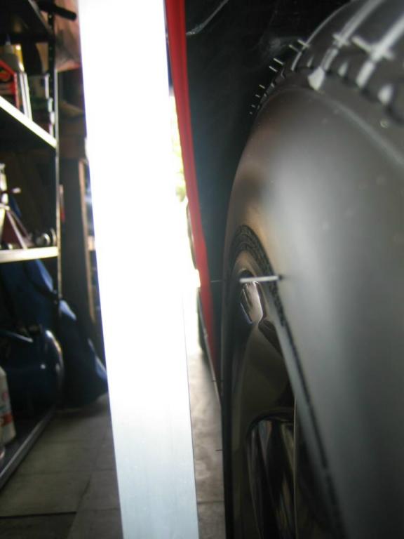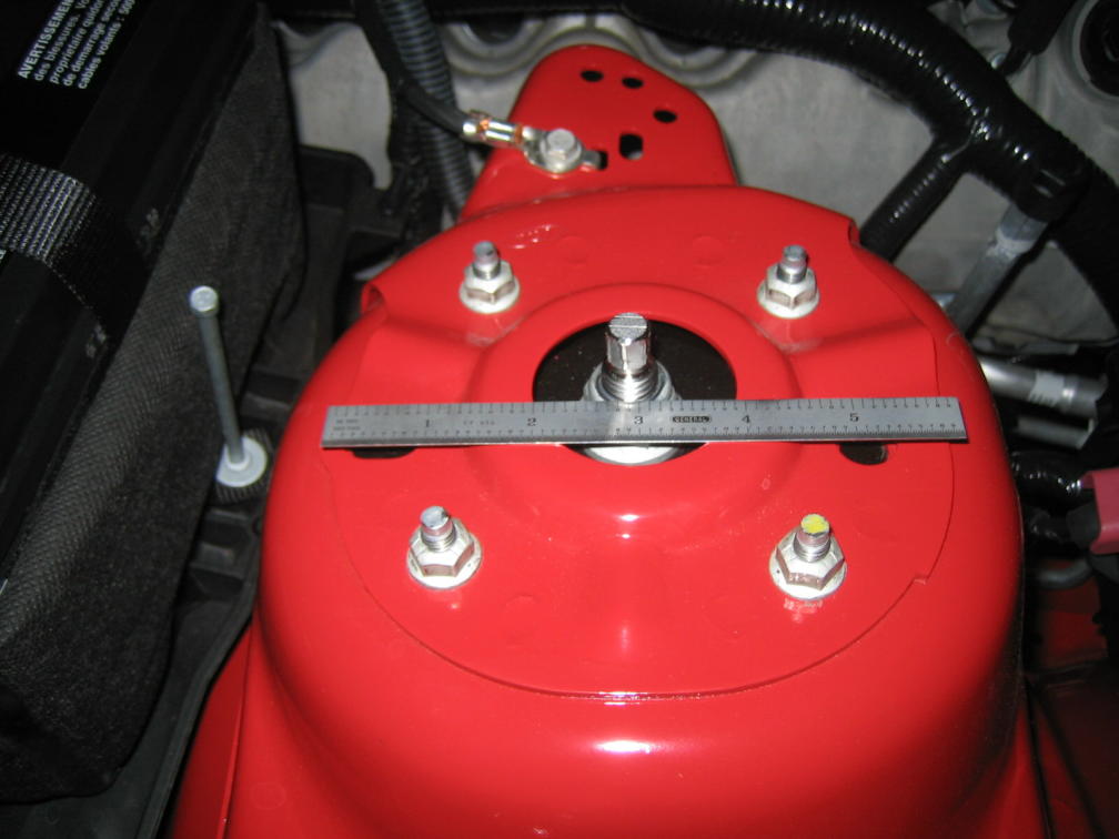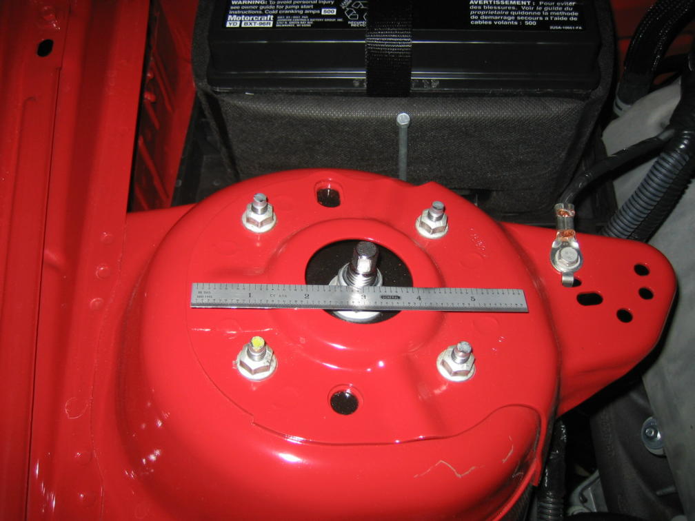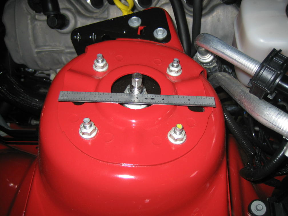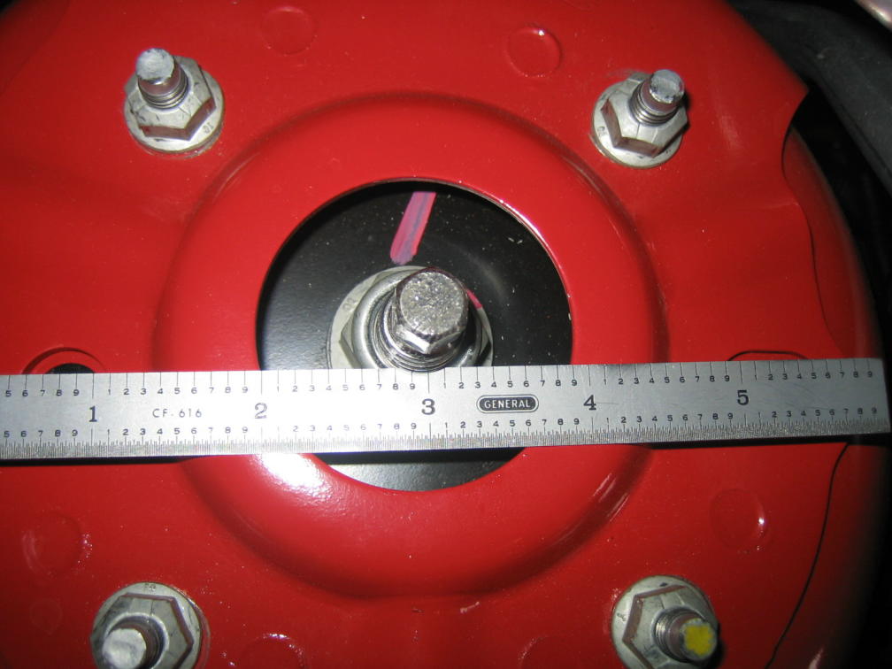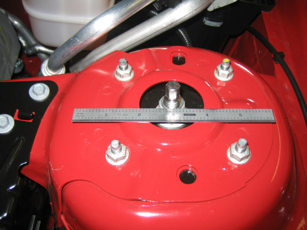 Bill... the nuts are on the studs now, so you can't see in a pic. With the nuts loose, stand on the side of the car and pull the center stud toward you (outboard) and tighten the nuts. The center stud should be closer to the fenderwell. This adds + camber. Not much, but it might be all we need. (With the billet caps, you can't tell the center stud is not centered, and any missing paint around the nuts is covered, too!)