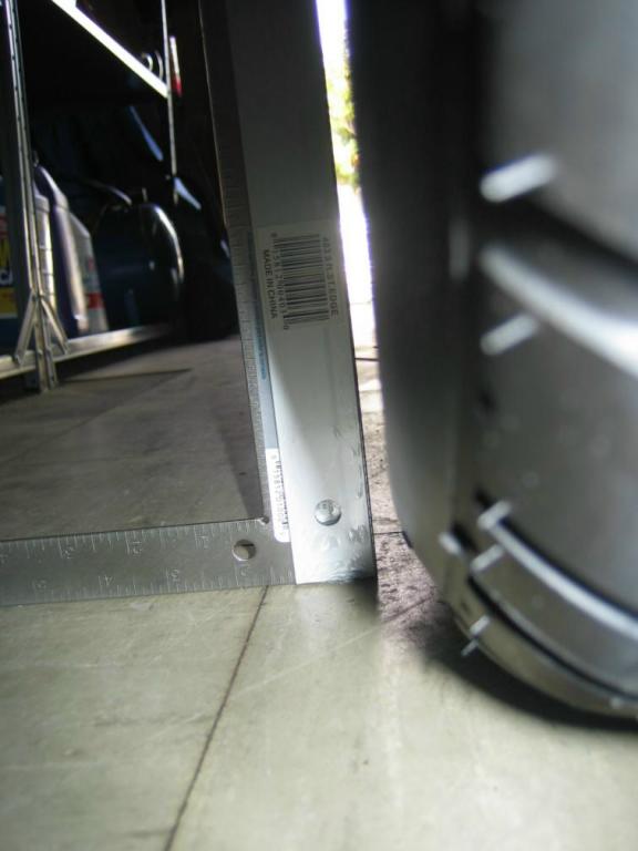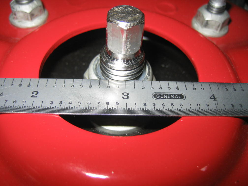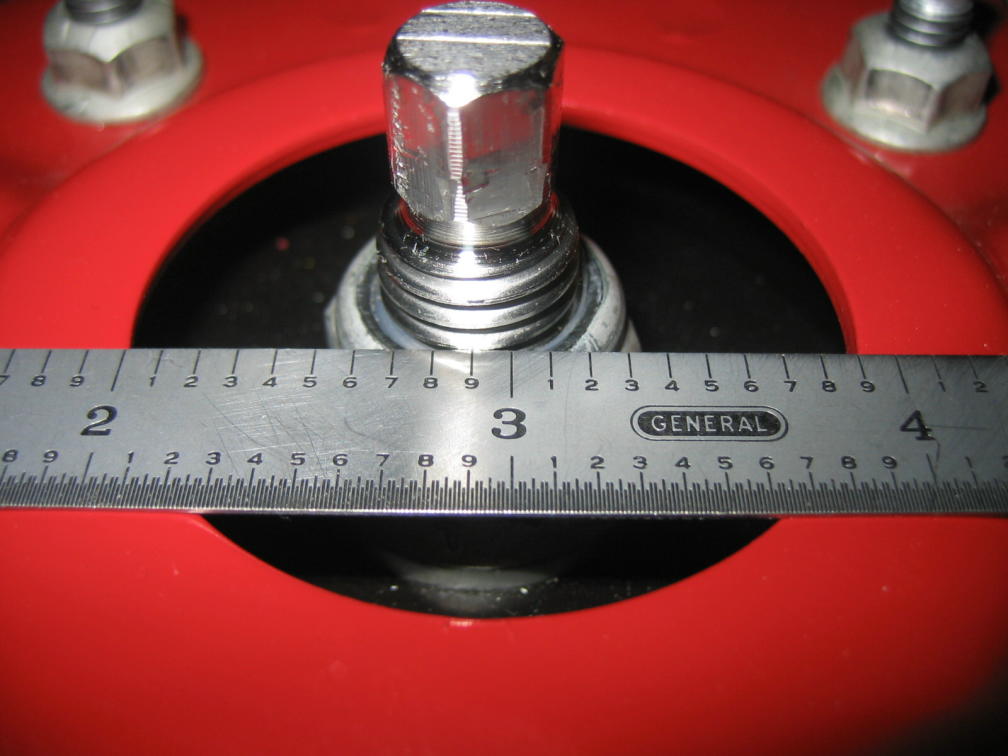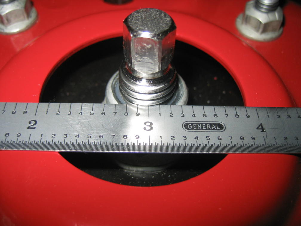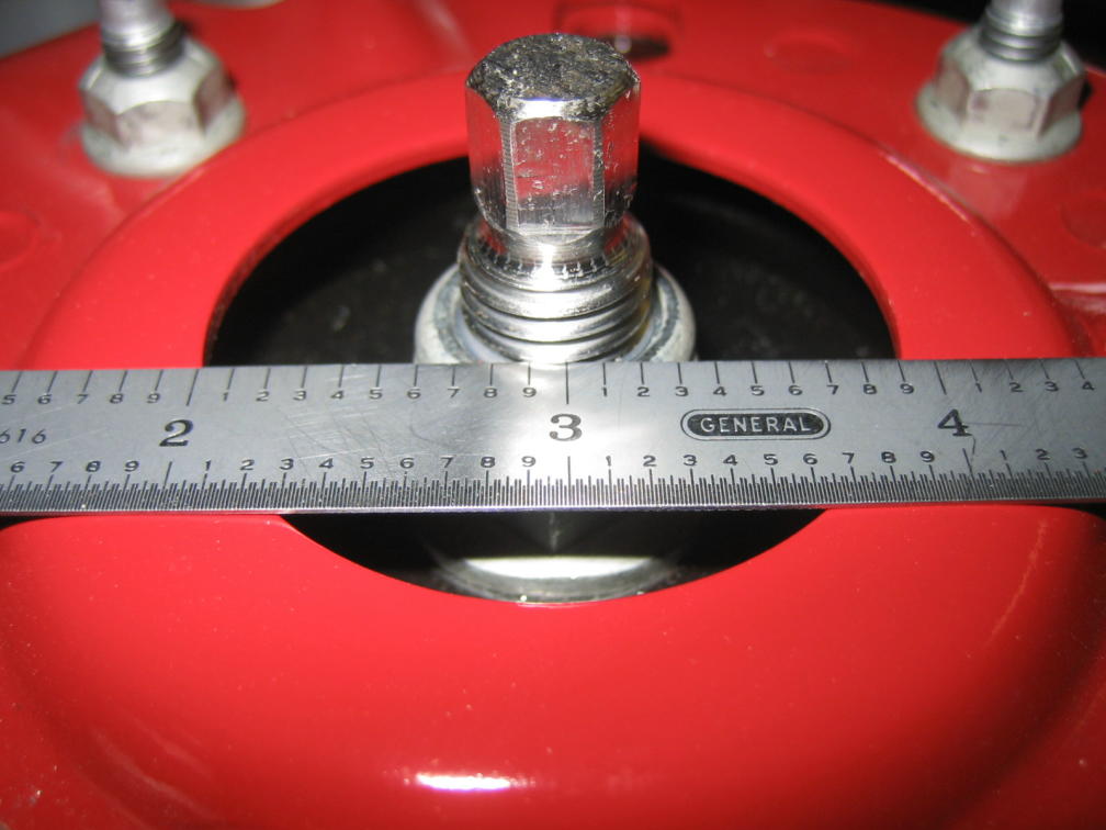 Driver's side, looking aft, 2" mark on scale lined up to hole opening, scale butted up against the threaded stud.