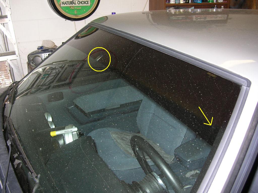 The circle shows how the tint runs along the bottom of the rear view mirror, and the arrow shows how low you are ALLOWED to have the tint (we all have a mark showing how low you can tint on the windshield). The "brownish" part of the tint is the factory tint (which you don't see, but again, the flash really lights everything up and brings out stuff you don't normally see - normally the strip all looks like the rest of the 20% tint).