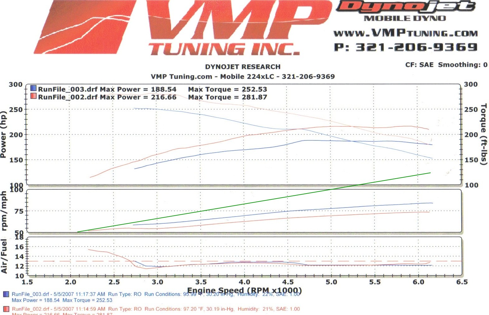 Here is the chart. It still made 271 BHP, and the clutch was slipping practically the entire time! He printed the RPM-to-MPH graph for me - and the green line shows how fast the rear tires SHOULD have been going versus the red and blue lines which show how bad the clutch was slipping. The green line is based on the formula MPH = (RPM X tire diameter) ÷ (rear gear ratio X 336).