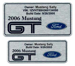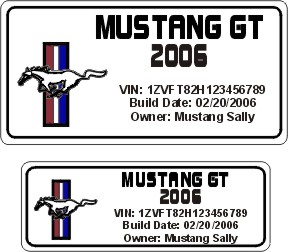 The engine bay tag is 2" x 4" and the interior console tag is 1 1/4" x 3 1/2". I don't have a weblink for these particular tags but it's basically the same info on the link here at the Mach1Registry for the Mach 1 ID tags: http://www.mach1registry.com/products/id_tags.htm