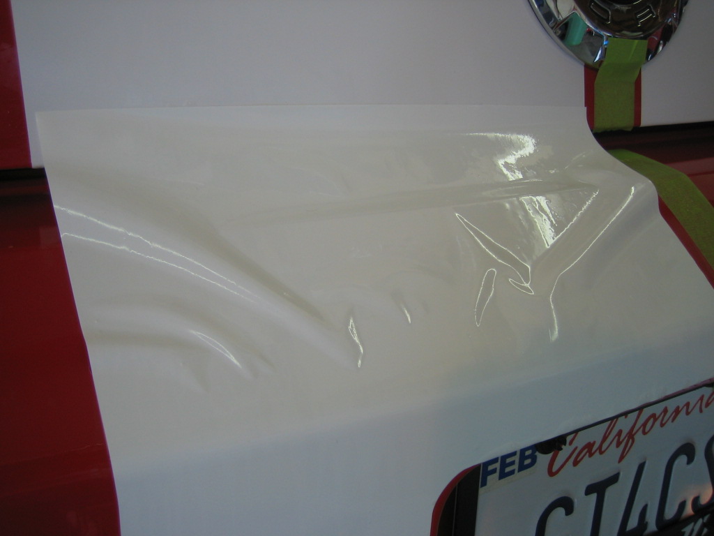 Rear bumber: This was a pain on the first side we did. It would start to crease everywhere as it was positioned where I wanted it to go. I started to wipe the vinyl down at area adjacent to the license plate and worked in both directions (up and down) from there. Heat (from the blow dryer) helped alot. Had to go at a snails pace; heat, wet, squeegie, hold and heat, repeat. Opposite side went smoother and quicker for some reason.