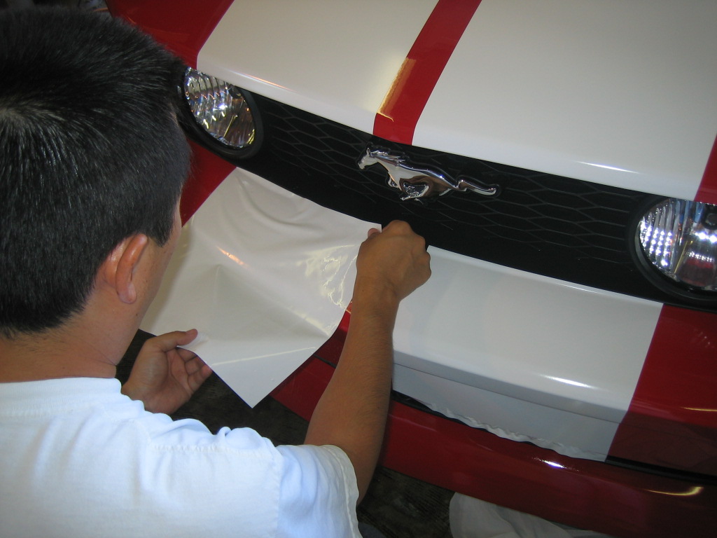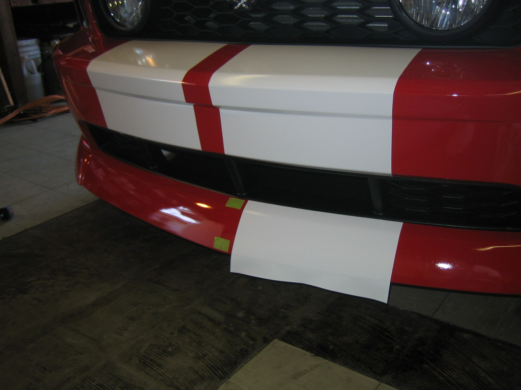 Front bumper: Heat is a must, period. Process was like the rear bumper, it took what seemed like forever just to do that small length of vinyl. It could be my rookie skills, but it seemed impossible to stretch the vinyl towards the center nose to maintain the 2" gap and not crease the rest of the vinyl all to heck (remember, I'm dealing with 12" wide stripes). This whole process was slower than a snails pace, I really think a snail would've beat be down the vinyl.