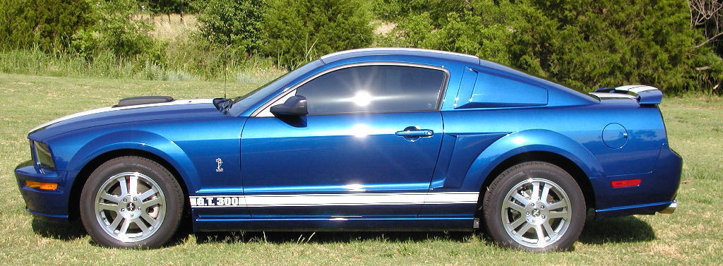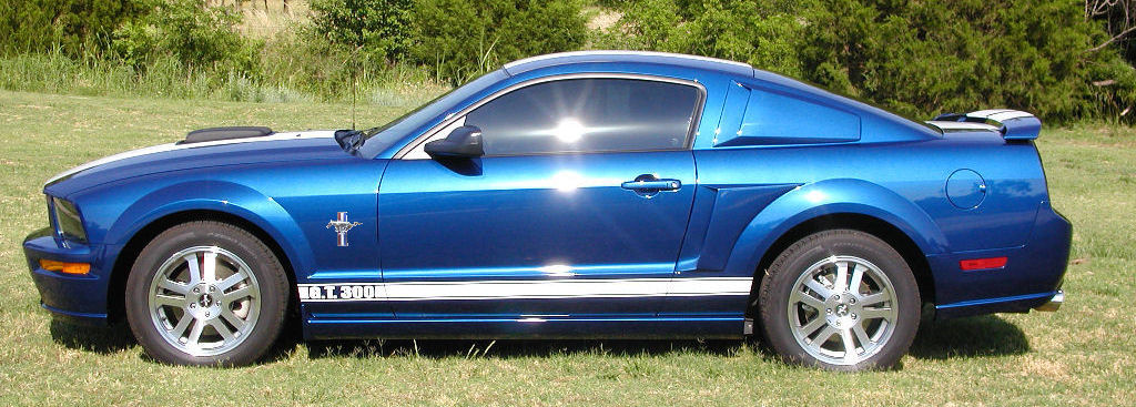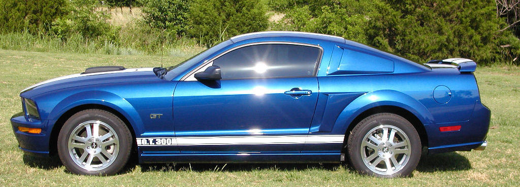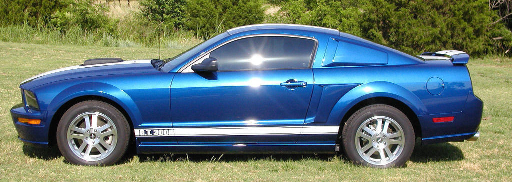 Just the stripes at the rocker panel level, or just the word "M U S T A N G" in the stripes also screams V6. So, it has to say something like "GT 300", or "Mustang GT", etc...