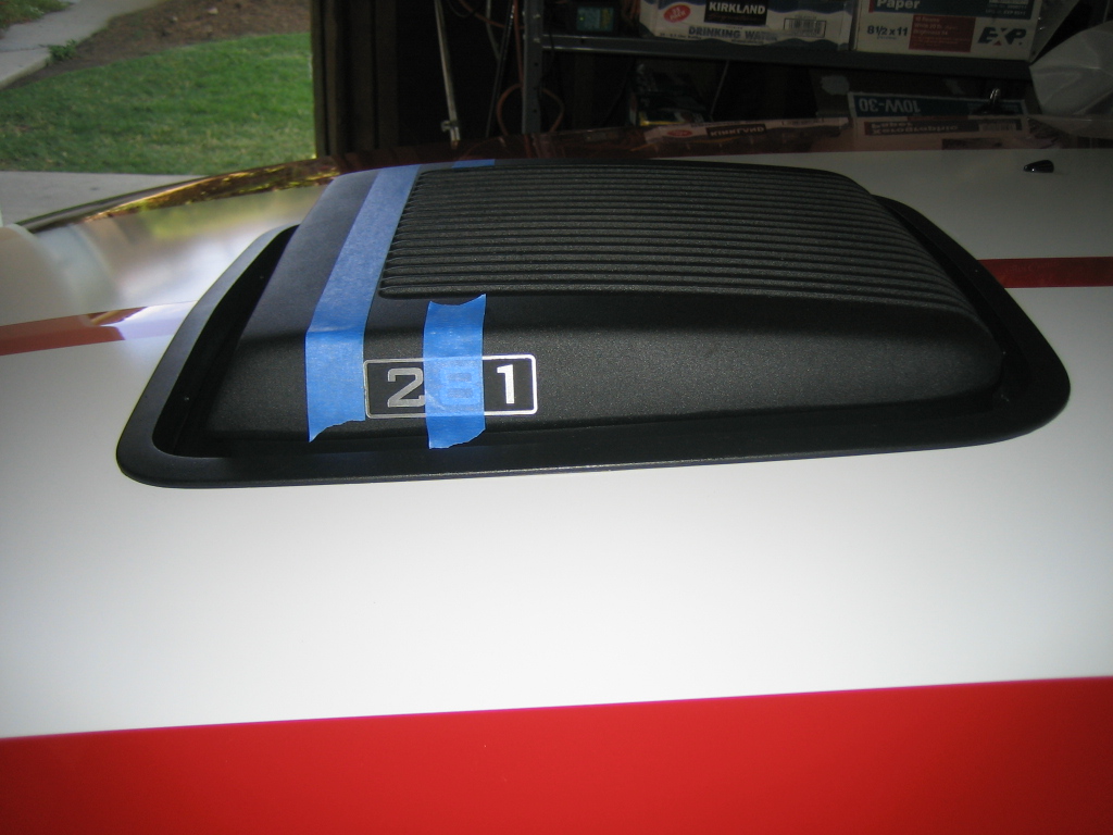 Also, there's the question of how far forward (or back) should the emblem be on the scoop. The 69/70 Shaker scoops had their CID emblems near the front of the scoop opening and the center reserved for any script emblems (e.g. Cobra Jet). I placed the leading edge of the emblem even with the top center cooling fin/rib. As far as up and down, I just chose it to be closer to the lower half.