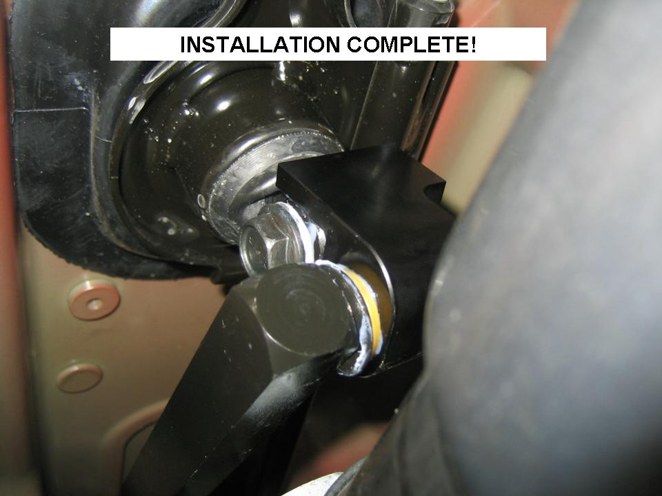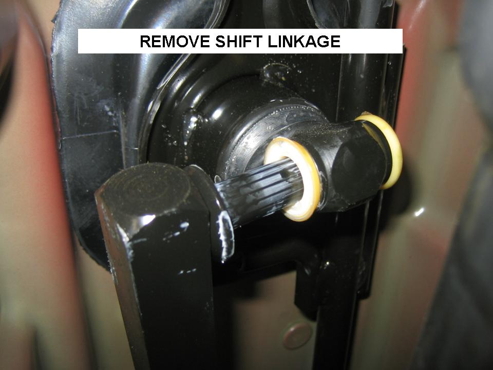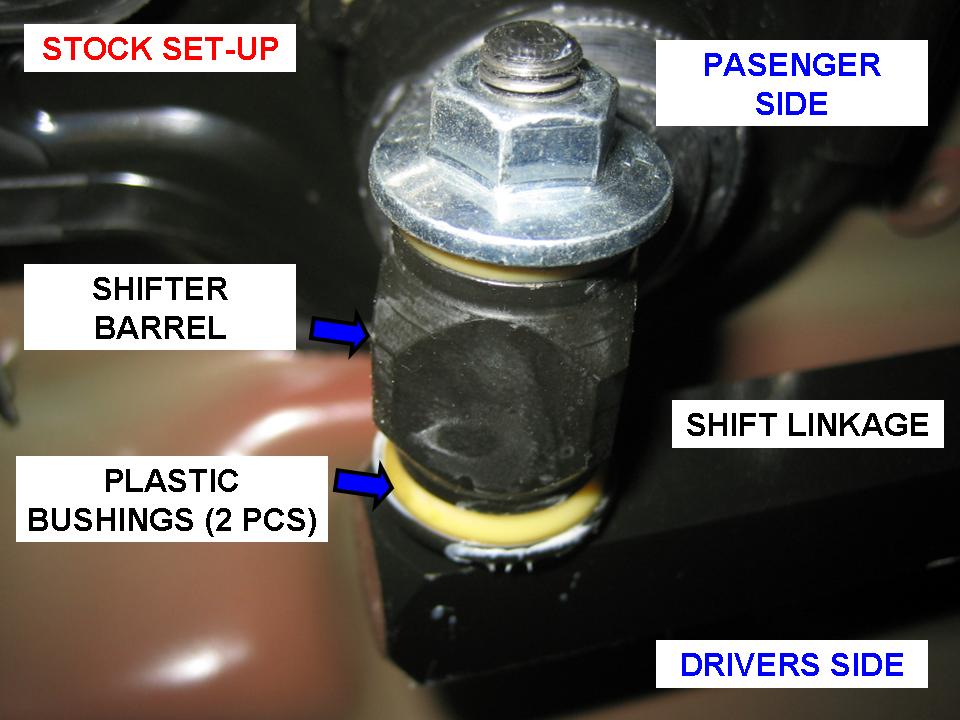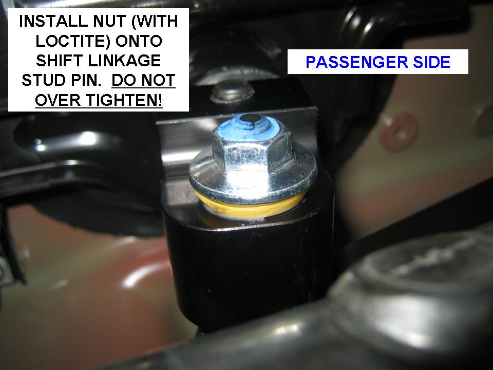 * Loctite the OEM nut that goes on the shift linkage stud pin. Use caution when tightening this nut, DO NOT OVER TORQUE IT! I only brought the nut down until it made contact with the plastic bushing, then gave it an additional 1/8 turn. If you tighten this nut too much, it'll make shifting (into the gates) very difficult.