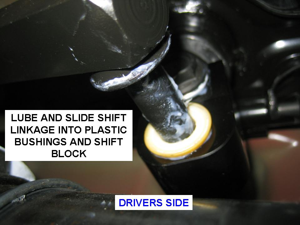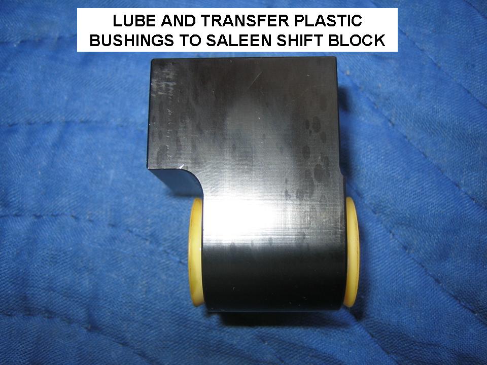 * Lube the shank of the shift linkage stud pin before inserting it through the plastic bushings (in the Saleen block).