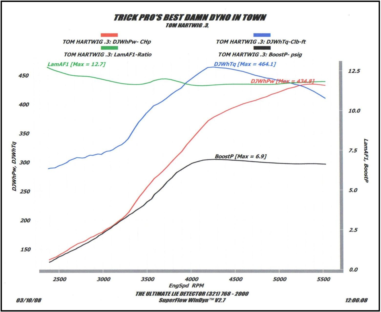 434.8 RWHP, 464.1 RWTQ, 6.9 psi, 11.7 - 11.8 A/F Ratio