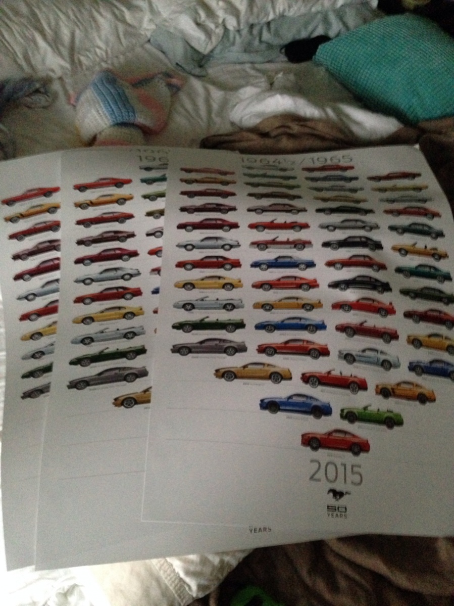 Took to the dealer, an hour trip each way, for his first and free oil change. It was dirty after the weekend rain storms. I had not washed it yet because there is a chance for rain again tomorrow. To my surprise, a car wash was included in their oil change program. While there I got a 50 years of Mustang poster.