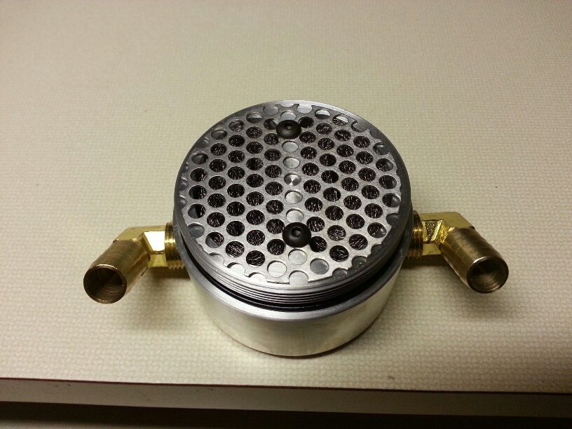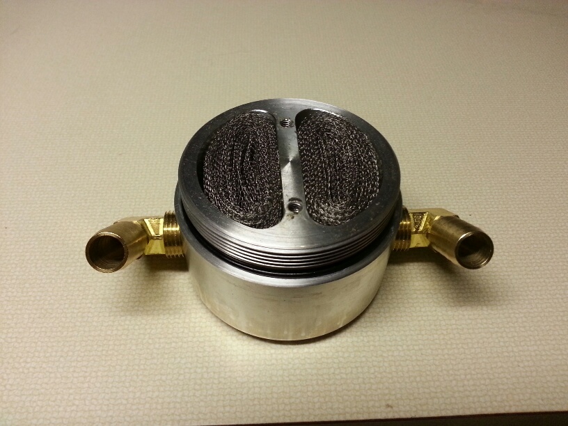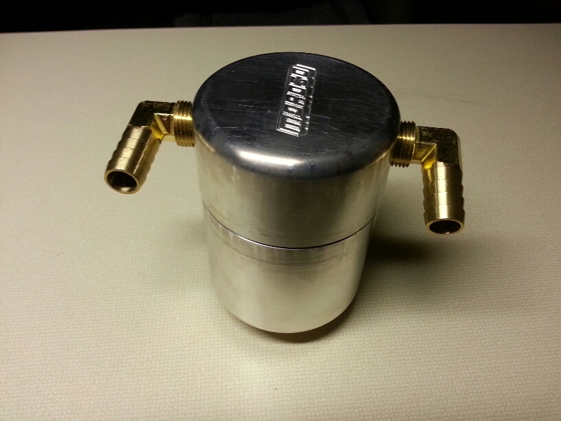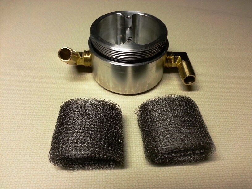 With the ongoing discussion about oil separators, I dissembled a Moroso large body separator today for cleaning. This design flows air/oil thru the separate inlet and outlet chambers and uses a stainless steel filter screens. Cell phone camera quality ...