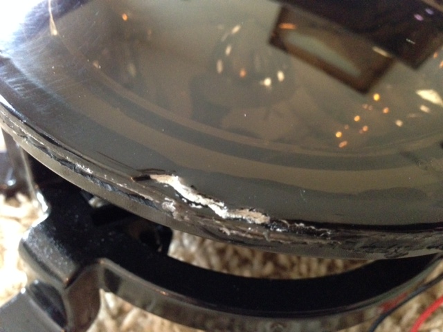 a) A large crack on the edge of the lens where they "opened" it up then resealed. Not only will it be visible from the outside, but that's a major cause/concern for moisture and water seeping in.