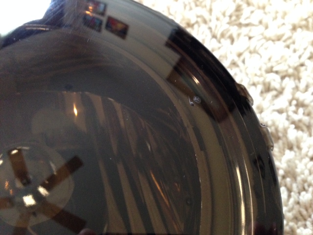 b) There's either a "glob" of adhesive or something else on the right side face of the lens. It won't come off. Tried scrubbing it, cleaning it, rubbing it off...even claying it. I even started marring the rest of the lens surface so I stopped. Not sure if it's even a burn mark of some sort.