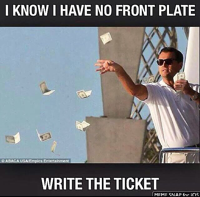 Whatever, CA has the front plate law. He probably sees 100 cars a day with no front plate, but I get that as a punishment because he's mad? And that, is why people hate CHP. I showed him this picture as he was making me sign the ticket, hoping to get a laugh out of him...