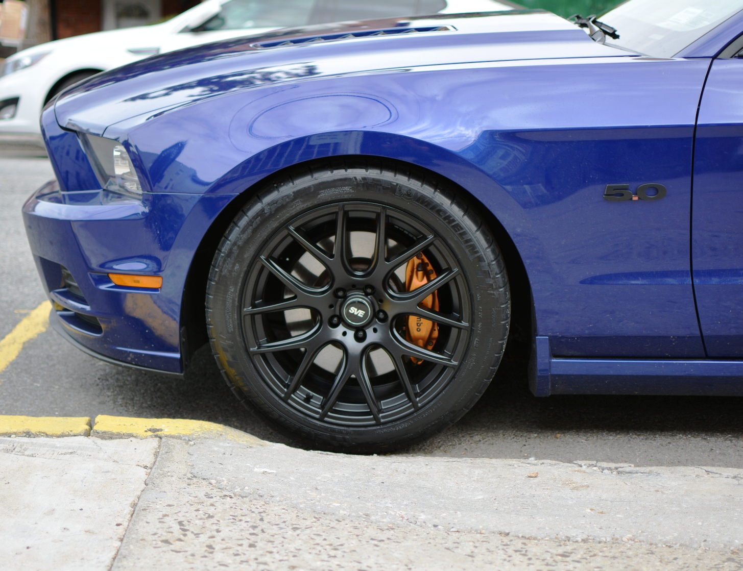 Put on my new tires/wheels and wrapped part of the hood vents. I got SVEs with Michelin PSS 275/40s all around, black doesn't stand out much on the dark blue, feel like I should have gotten charcoal or gray wheels. Drove it a bit, the PSS does ride a bit more comfortable and seems to absorb bumps better, didn't really get a chance to push them. I like them, but the sidewall design is pretty unattractive and boring.