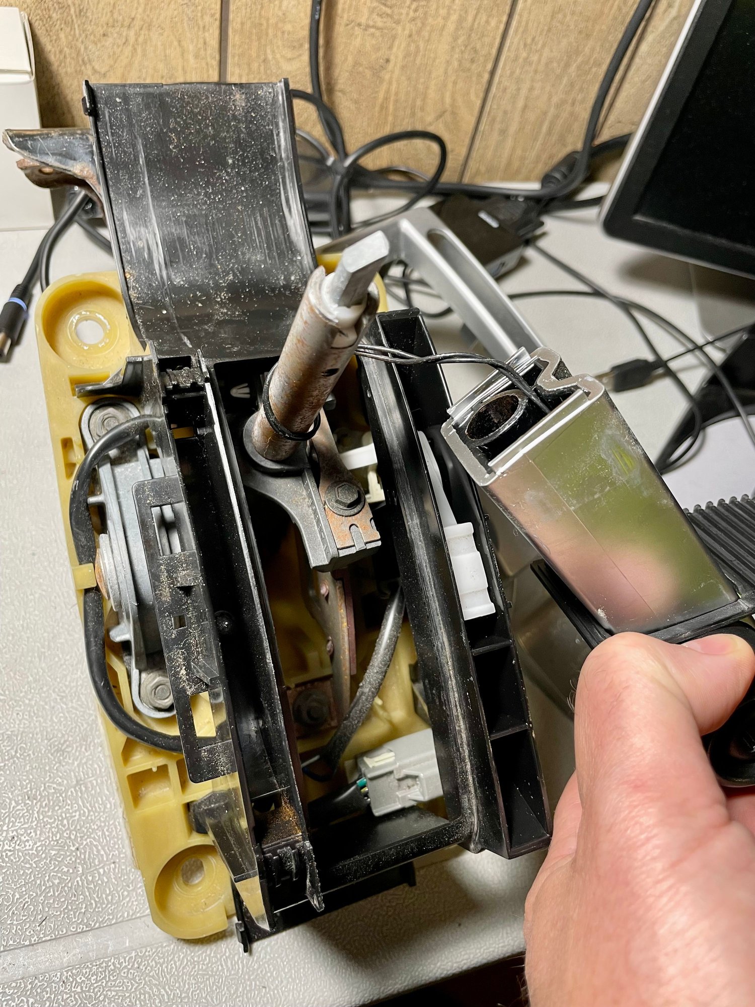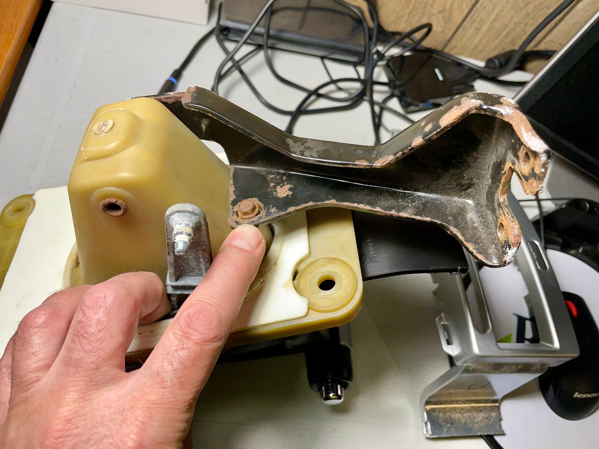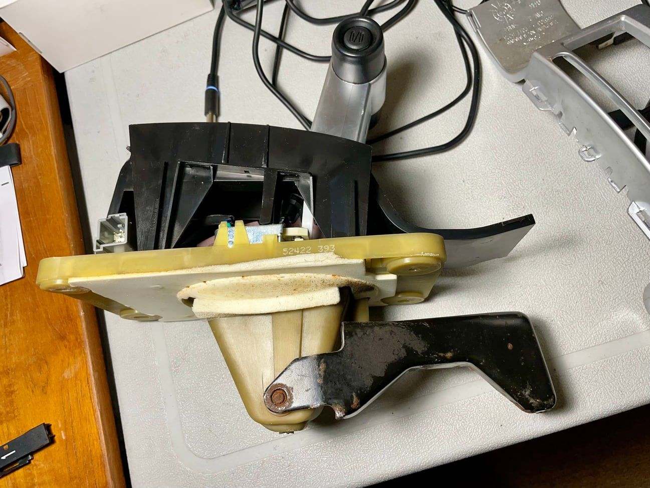 I stand corrected on something I posted early in this thread. Rick’s 2005’s shifter is likely original and not swapped out by the previous owner. I now understand why he noted boring out the White Madness shifter to fit the larger diameter post. I dissected my 2006 shifter and found it does not match the pic I re-posted of the square plastic stump. It would appear early S197s likely had a different design where the plastic block was part of the T-handle (Pic 1). Mine is an early 2006 (mfg 8/05), so there had to be a revision sometime after that. This earlier design, it’s worth noting, is a 2-piece design, where the linkage bracket is stamped steel and is screwed onto the plastic body of the shifter (Pic 2). On mine, this screw had backed out several threads, which probably explains the sloppiness I was feeling. I was attributing this to the mostly plastic design, but that’s probably not the case, as the 2010 has even more plastic, though with its one-piece design, the linkage bracket is part of the main housing. Anyway, for Rick, or anyone who still has this original design on their car, it’d be worth checking that screw if your shifter action is feeling spongy (Pic 3).
