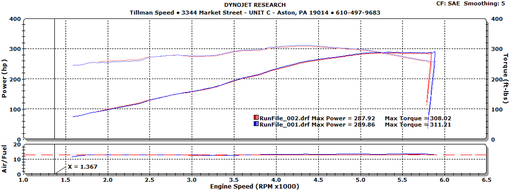 Today I had some work done to the car at Tillman Speed (I was in the area due to business travel). On the docket was an aluminum driveshaft and a dyno tune, to make sure the car's parameters were drilled down properly. Well after they driveshaft was installed and they put it on the dyno and flashed it to a generic 93 race tune, the results were surprising. I figured the air-fuel ratio was going to be close and at most I was going to see a 5hp difference (one of the techs pointed out that the driveshaft wouldn't make a difference on the dyno). A/F at WOT was about 12.8 where it was supposed to be, but power SUCKED at a pathetic 273 rwHP (compensated for atmospheric conditions). Now CR told me that stock dyno's at about 255 (from experience). They went to work (by the way...these guys at Tillman know their ****) and by the end of the session they got the numbers drilled in, very consistently at that. The numeric results: 289.86HP and 311.21 ft-lbs. The results that actually matter...well let me put it this way, in 1st gear at 30 mph if I slam the gas I can break the tires loose. If I shift too hard into 2nd I can sustain the wheelspin. The acceleration is rediculous. I really can't explain it in words. That driveshaft does let the engine rev up in about half the time, just like they said it would. And gas milage on the trip back was pretty **** good at about 24-25 on the street race tune and about 25-26.5mpg on the performance tune. Totally worth the money