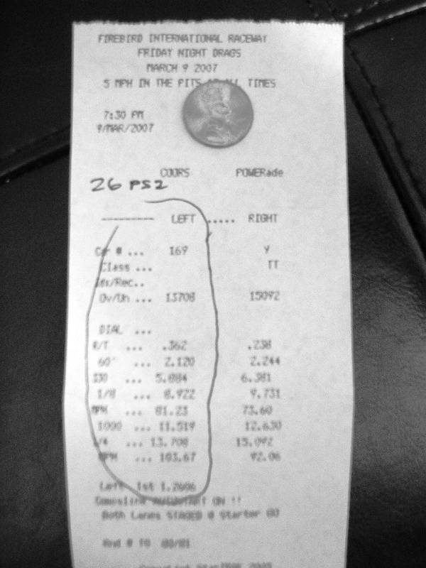 I was trapping consistently in the 103.5mph range, I think there might be a few more tenths left in her if I get a little more traction. I was cutting 2.2 60's *shrug*