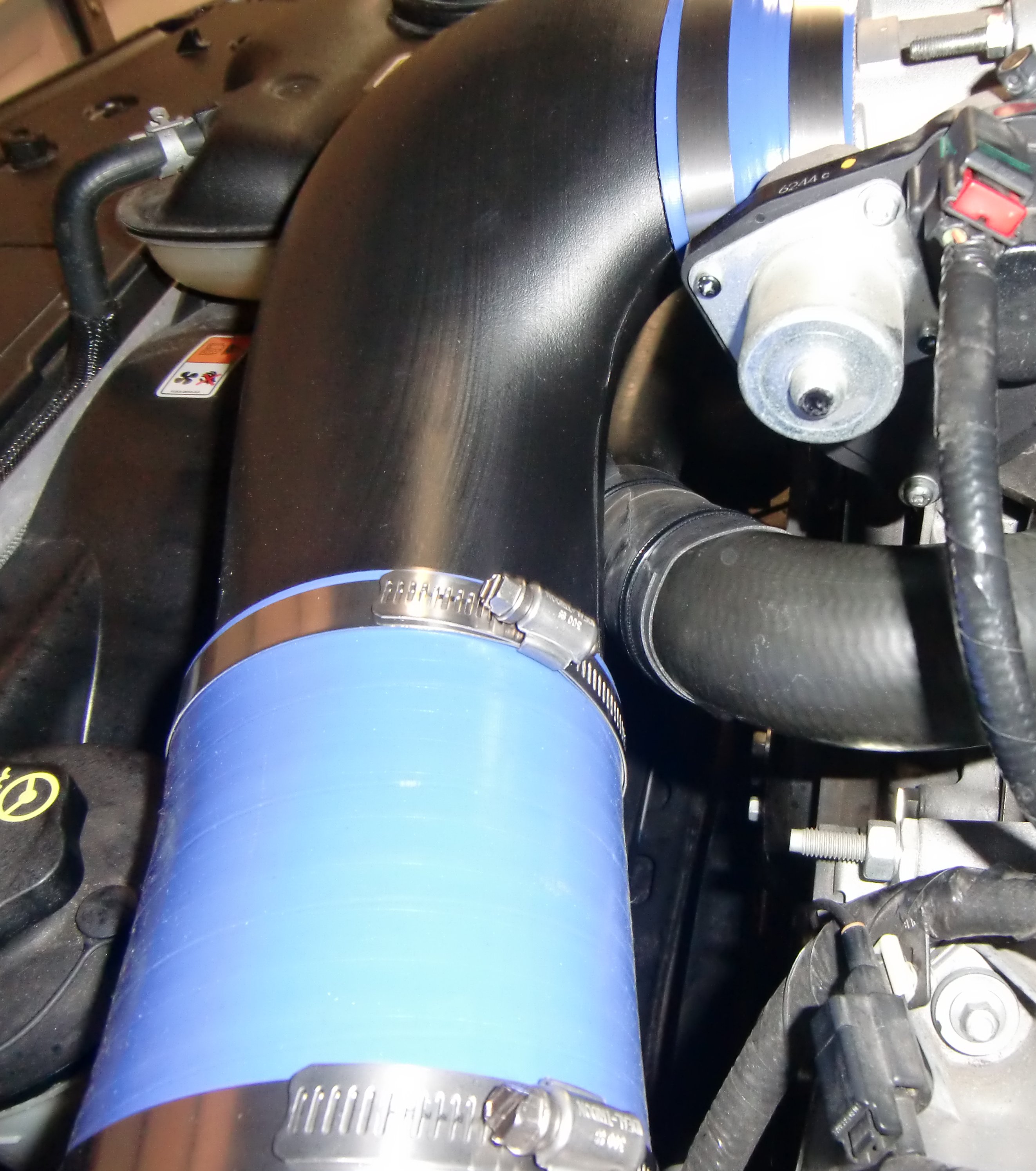 The Steeda elbow is not very flexible, it tends to stay in place with the couplings attached. The only way I could get the elbow installed was to first attach the couplings to the throttle body and MAF housing, then finaggle the elbow into place.