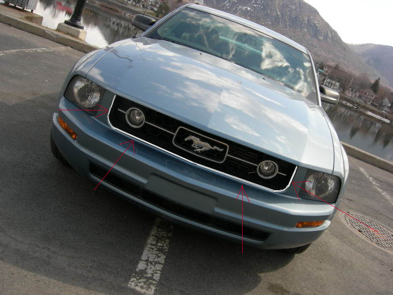 I ordered chrome bezels for the third brake light and the taillights. I was thinking I could do something for the front as well. Here is a modified photo of what I was thinking. It is reminiscent of the 1964/1965 Mustang. I haven't seen it done for 2005/2006 Mustangs so far (I don't know of any trim/accents distributors that have this). I will check out my local store for any chrome tape/stick on that I could use to make the effect more realistic, see what it looks like. I was thinking of taping it on the black plastic edge of the grille. It would be a U-shapes so I get one continuous piece.