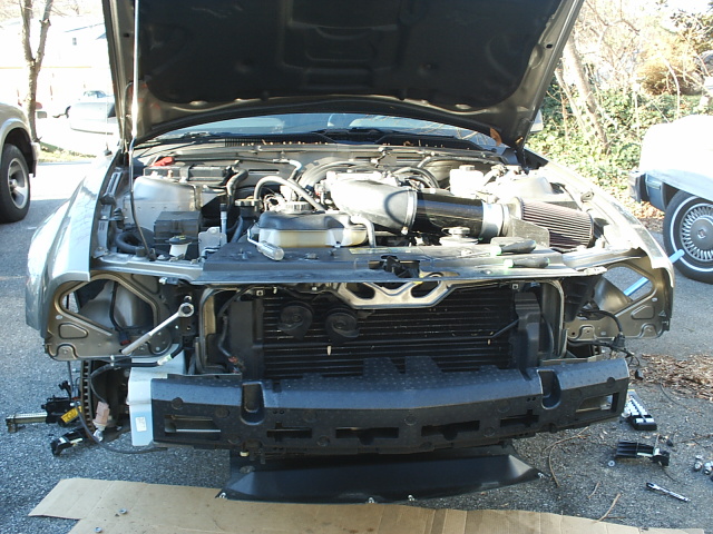 Well I finished my swap today. Sorry I don't have any completed pics yet because it got dark so danm fast. I'll take some tommorrow and I'm gonna be test fitting my new roush scoop as well to see if I really want to put it on or not. Maybe you guys can help me decide then. The attachments are of the stock front off. All my parts were from Kevin Casey(www.clevparts.com)(05stangkc) he is fiving awesome! And I used 2L8IWON's how to thread which helped alot. Again sorry no completion pics, I'll get them tommorrow