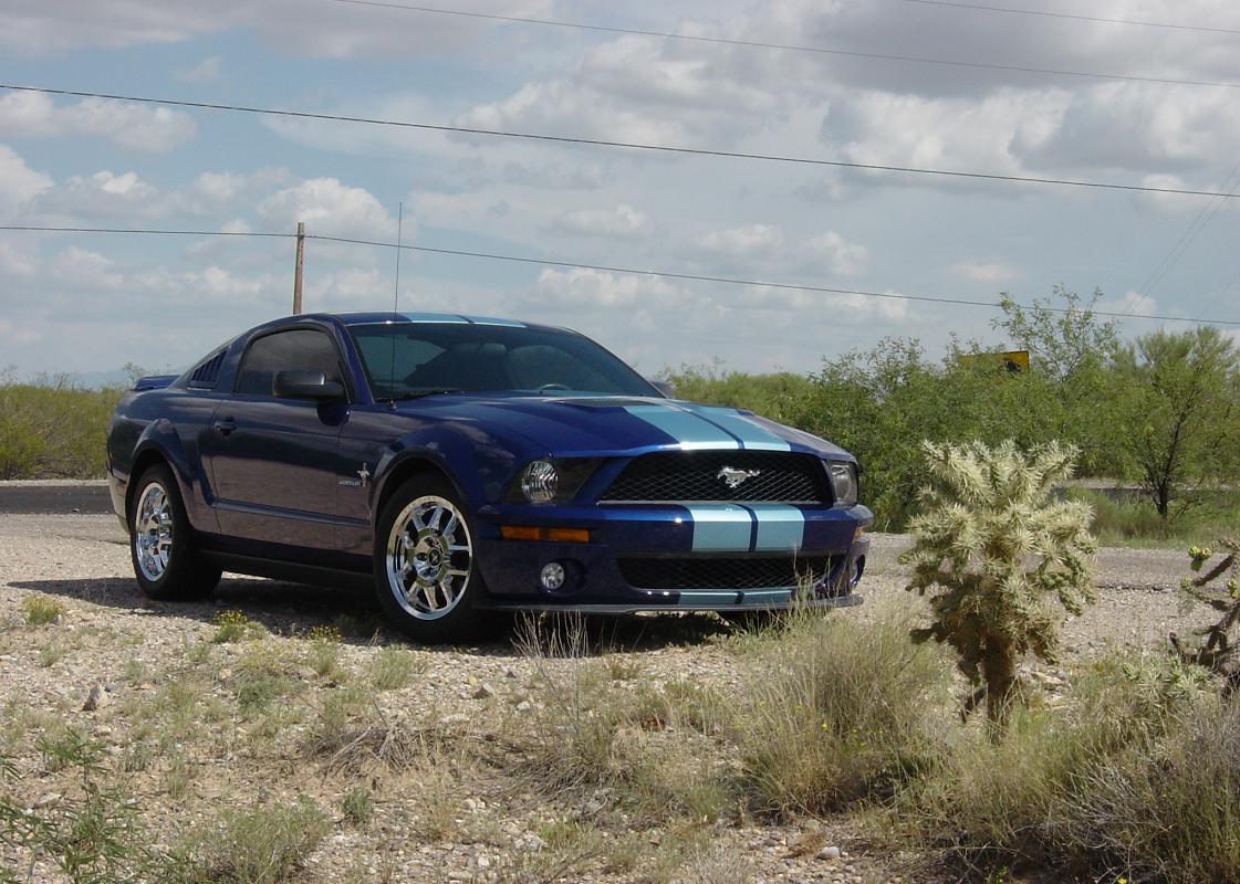 I got my mustang about a year ago and have forever since been comtemplating on what direction to go with it. It is a vista blue v6 pony package so i was wondering if anyone has pics of a vista stang with much black on it( rims, stripes, dark tint, etc...). Any pics would be great. Thanks
