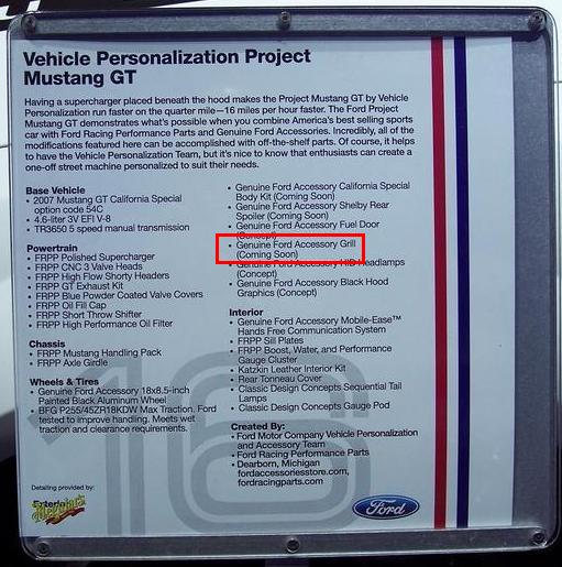 I talked to the Merchandising manager from Ford about this car, it's not for sale, it's a demonstration of current and future accessories from Ford. The girll will be out, and it is the GT pattern with no blockage or fog lights, but it won't be out until later next year (mid summer). The seats are Katskinz that they will license and start offering through parts departments, and everything else as well, including pre-packaged GT/CS body kits like Kevin has already been offering.