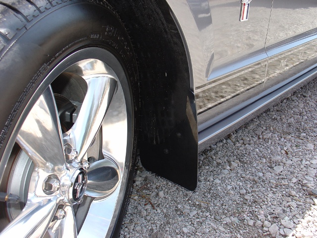 No pics...but I've had the GT500's on the front of my car for over a year. Regular GT molded ones in the rear, both painted mid-gloss black to match the lower blacked-out trim on my car. Install took less that 20 mins on each side, very effective in keeping the road grime off the sides, and greatly reduces the "spray" effect when I run the wider off-set rims. I paid less than 20.00 for the pair from local Ford dealer.