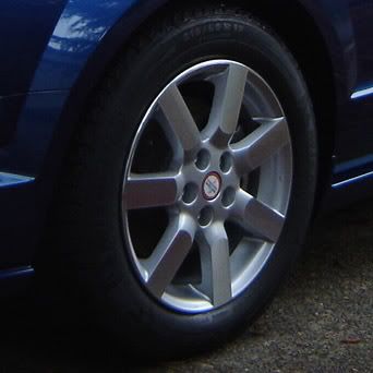 2006 Nissan Maxima! They're 17X7 35mm offset. I got a good deal and got the 4 wheels from a buddy for $200. I removed the Nissan logo from the cap and made my own tribar pony emblems . I think these Maxima wheels look a bit better than black steel wheels...