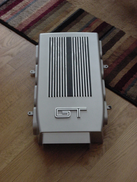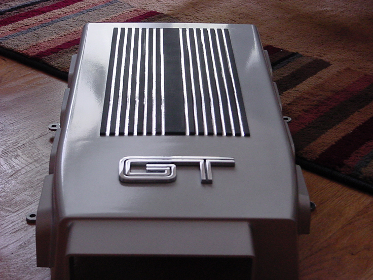 Decided to start cleaning up my engine bay the other day and wanted to add something to my MWAG plenum. Sprayed the "fins" flat black, and added some chrome tape in between. 1/8" tape is the perfect fit. Now I'm thinking of replacing the GT logo with one of the Powered by Ford badges...
