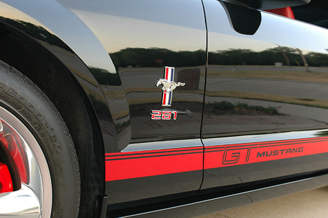How about using the Tri-bar Pony emblem with a 281 below it? That way the GT is implied by the displacement (identity) and it will look more Retro (in my opinion which isn't worth @#$%).