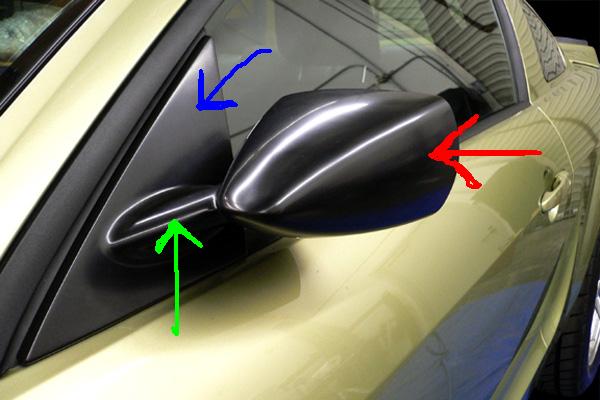 So, the mirror housing (red arrow) is painted body color. The trim piece (blue arrow) stays black. How about the mirror housing support (green arrow) body color also or leave black as well?